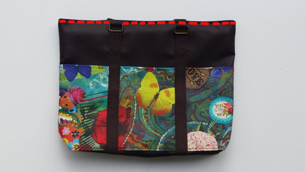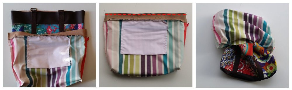 Como os decía, he utilizado polipiel de color marrón y tela impermeabilizada tipo hule de colores. La vamos a utilizar para dar color al bolso y para tener unos grandes bolsillos que nos darán mayor capacidad. Haced un pequeño dobladillo.